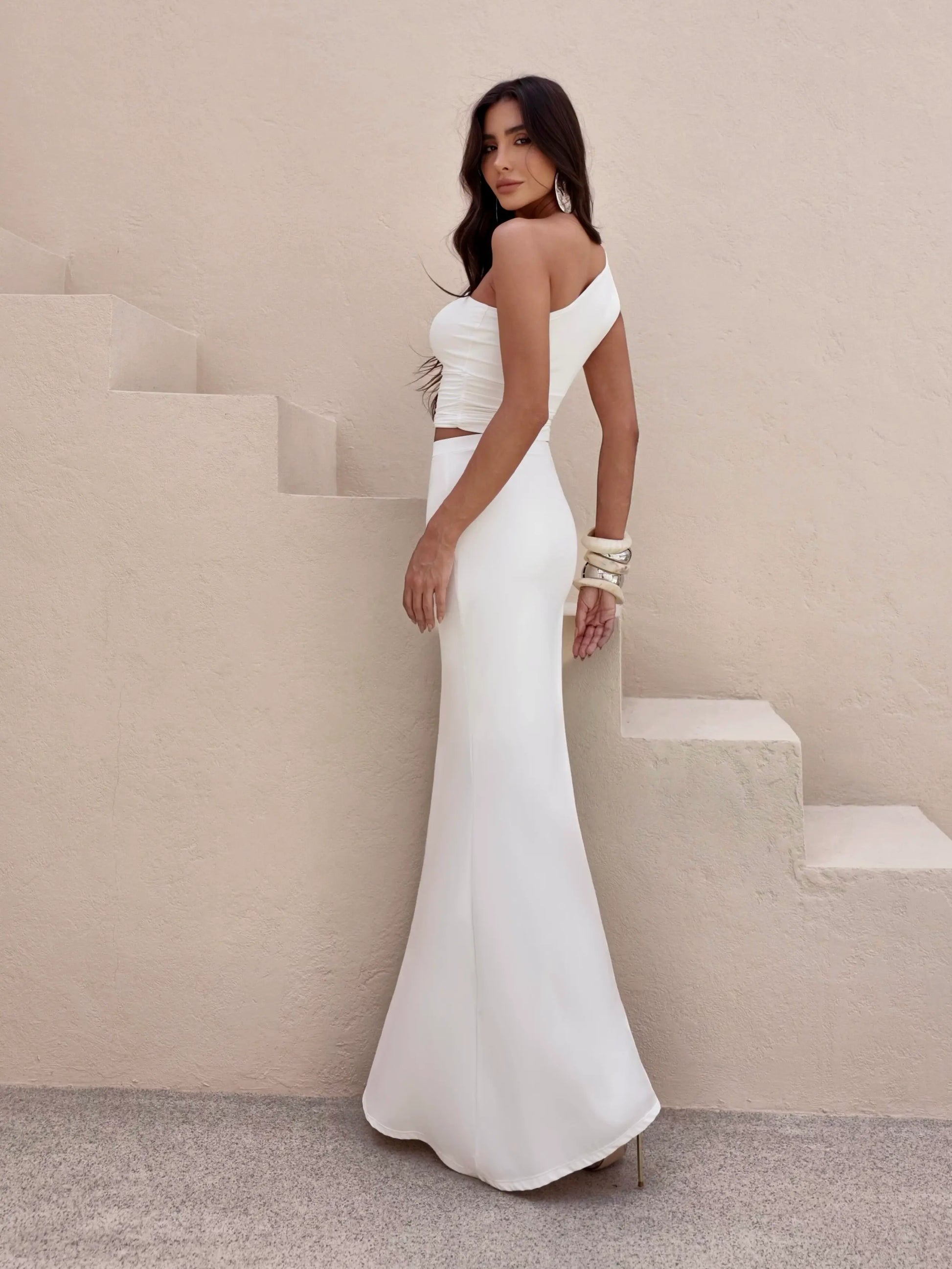 O top assimétrico de um ombro só valoriza o colo, enquanto a saia longa de cintura alta alonga a silhueta e garante um caimento impecável.