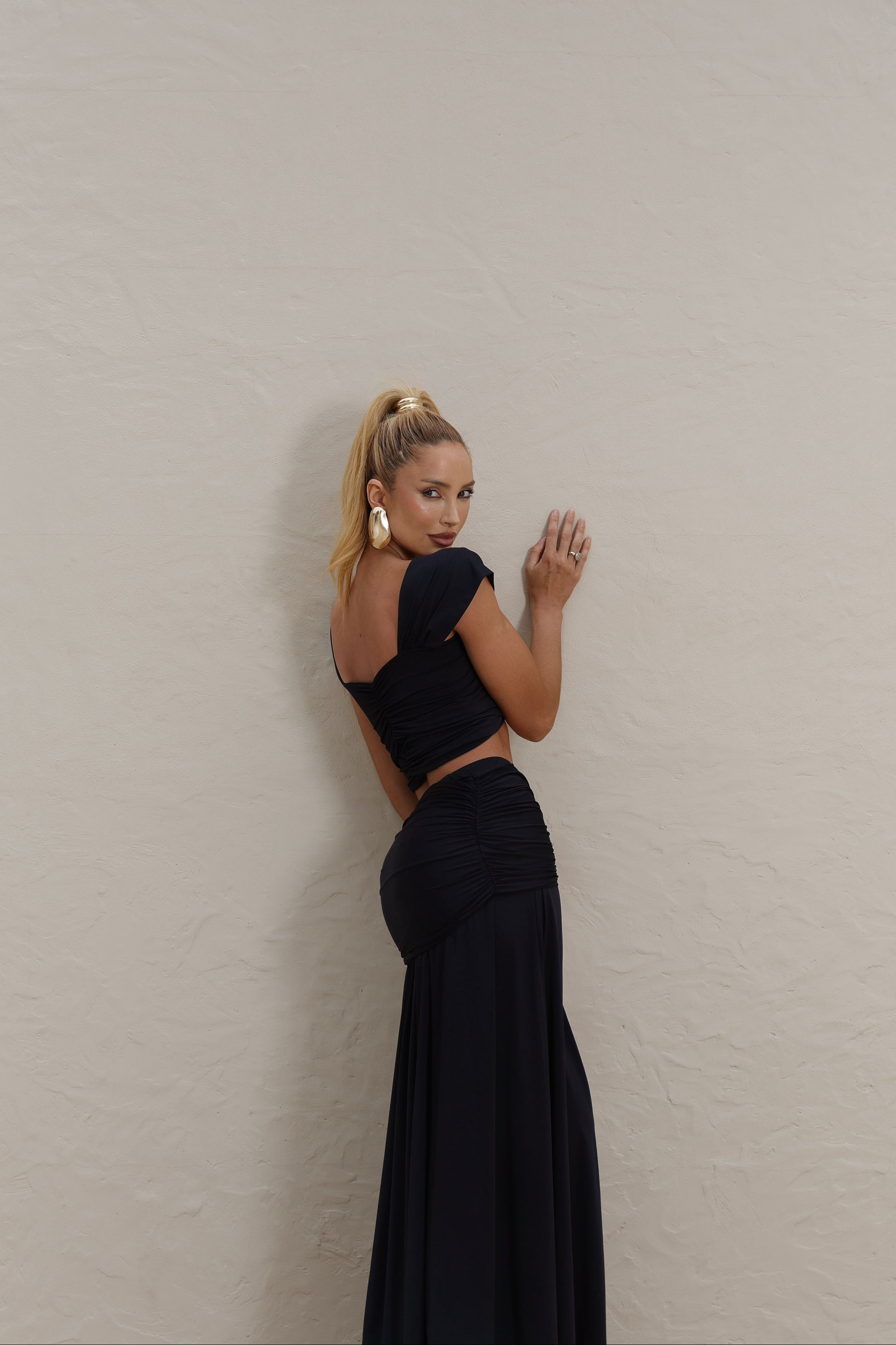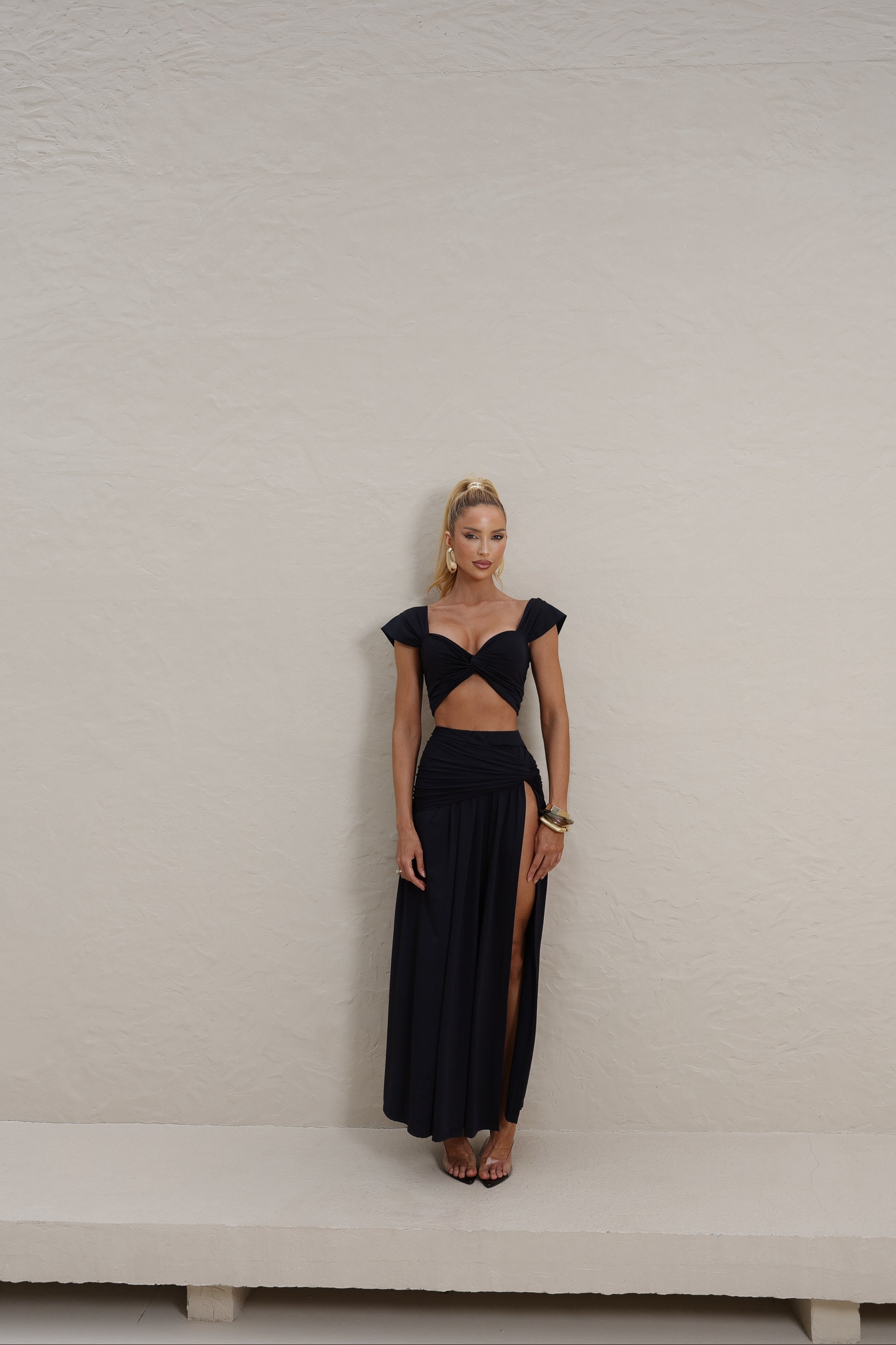 O Trijunto traz a combinação ideal entre estilo e praticidade. Composto por saia longa com fenda lateral, cropped torcido e cinto ajustável, é um look versátil que pode ser usado junto ou separado, multiplicando suas produções.