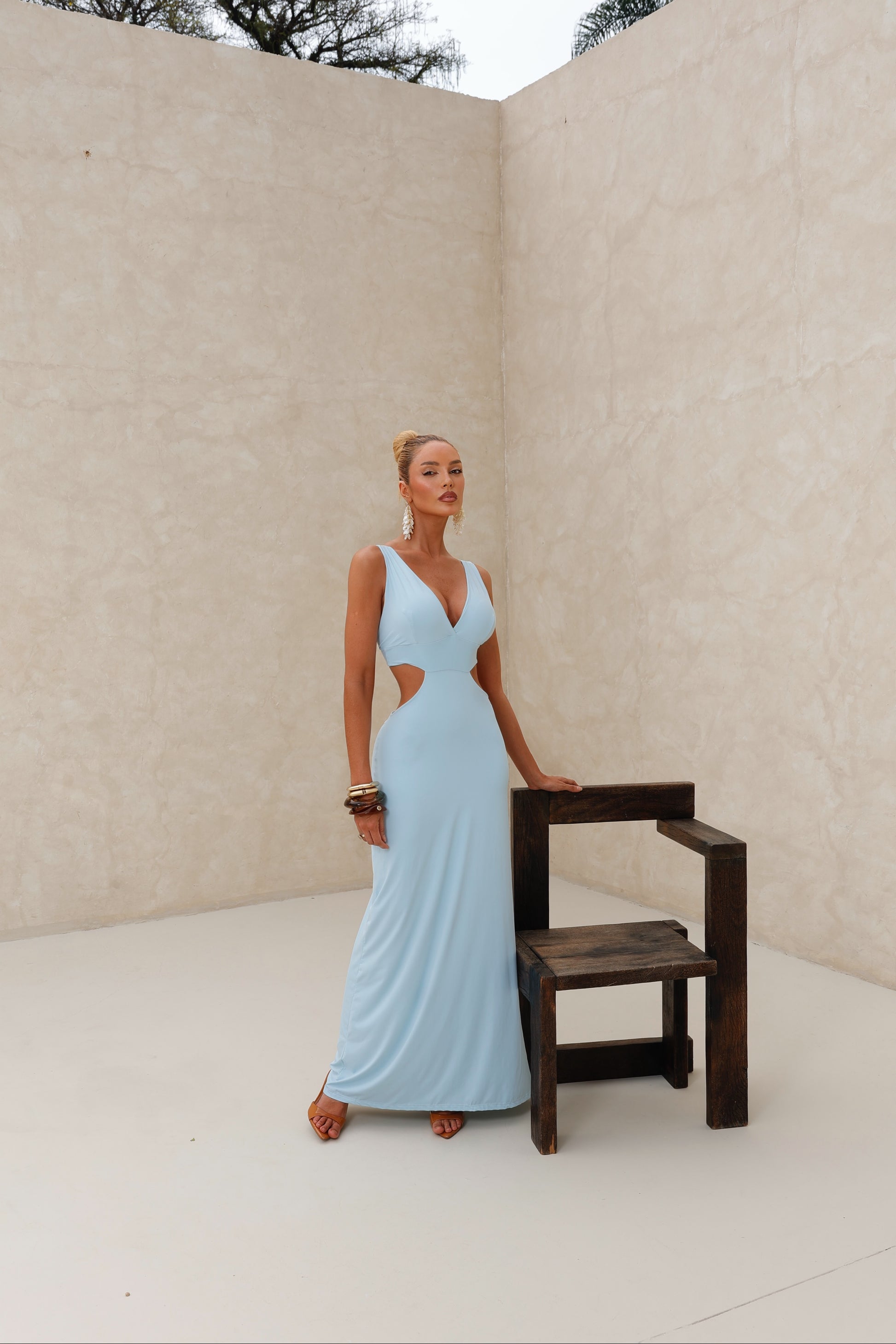 Vestido Longo em Poliamida com Recorte na Cintura Azul